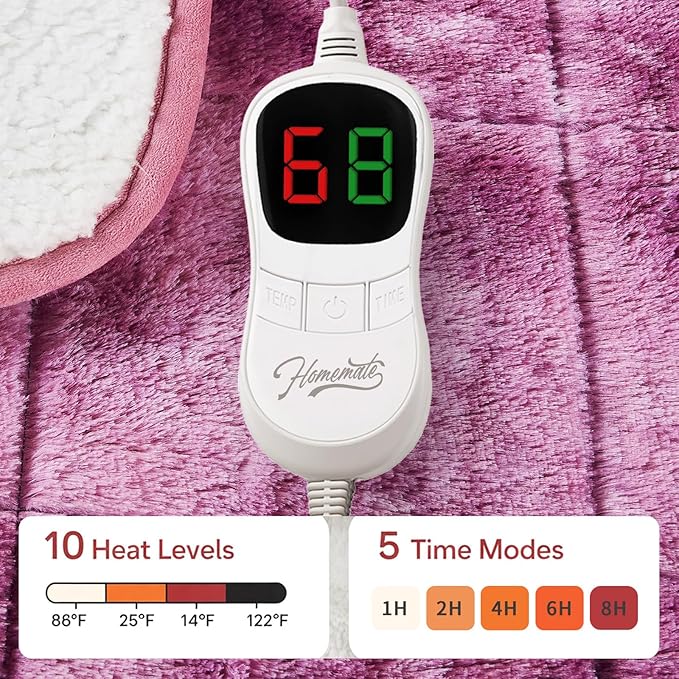 - Easy Control & Versatile Use:This electric blanket is very easy to operate with a single controller to adjust the temperature and set the time. Our electric throw blanket 10-20lbs comes with a 9.5inch power cord, which is very easy to move around and can be easily used in your bedroom, living room or office. This electric heated blanket also can be used as a heated shoulder pad or knee blanket to relieve your day's fatigue, a thoughtful and exquisite perfect gift for your loved ones!