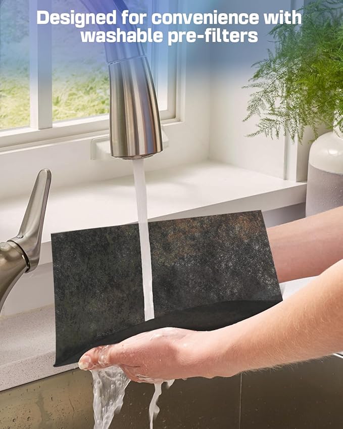 - WASHABLE PRE-FILTER: Simply rinse with water to prolong the 3-stage filtration system’s life. Paired with an activated carbon filter that helps with pet-related scents and smoke.