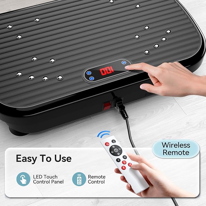 - 【EASY TO USE & STORE】Operate the PUREROYI vibration plate in two ways: with the included remote control or via the LED touch screen, the display allows you to see the time and speed for a clear view of your workout; Anti-slip coated design, impact-resistant ABS housing ensures the longevity and protection of the motor. Compact size( 21*13*5 inch), can be used anywhere, space saving, easy to carry and store