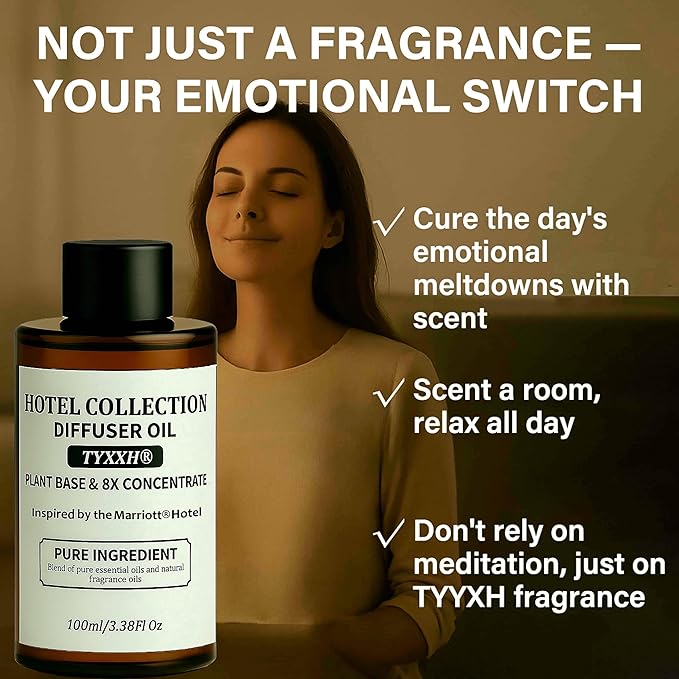 - ELEVATE YOUR MOOD & SPACE: TYYXH hotel collection diffuser oils do more than scent a room—they create a truly immersive sensory experience. Designed to support emotional balance and wellbeing, they help relax after a long day, ease stress, and promote restful sleep, while our cold air diffuser oil refined aroma enhances focus and mental clarity for work or leisure. With a multi-layered scent profile, each note unfolds naturally over time, creating a dynamic fragrance journey that adds depth, warmth, and sophistication—just like stepping into a five-star hotel lobby. TYYXH hotel diffuser oil don’t just fill your space with scent—they create a mood, a moment, and a lasting memory