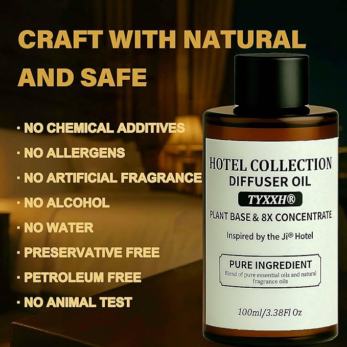 - CLEAN, SAFE & FAMILY-FRIENDLY: Our TYYXH hotel collection diffuser oil is hypoallergenic and carefully formulated to be gentle for kids, pets, and sensitive skin. Free from 26 known allergens—including nickel, latex, and gluten—it contains no harsh additives like phthalates, parabens, SLS, petroleum, alcohol, water, or synthetic colors. What you get is 100% pure, non-corrosive oil that diffuses smoothly and safely. Independently tested to meet strict safety standards, it offers peace of mind and comfort with every breath. Whether at home or in wellness spaces, TYYXH hotel diffuser oil ensures a worry-free aromatherapy experience—so every space feels safer, calmer, and truly cared for