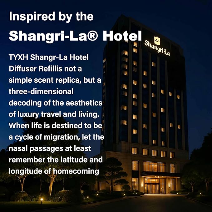 - BRING THE SHANGRI-LA HOTEL AMBIENCE INTO HOME: Inspired by the elegance of the Shangri-La Hotel, TYYXH hotel diffuser oil turns your home into a sanctuary of five-star luxury. The fragrance opens with Grass, Pear, Lemon, and Maple, like a breeze carrying nature’s vitality indoors. At the heart, Hyacinth, Ivy, Clove, and Ylang ylang weave a floral-spice harmony—refined and captivating. Finally, it settles into a base of Musk, Oak, and Fir, grounding the senses with warmth and sophistication. Evolving for 6–8 hours, the scent is natural yet powerful, soothing yet unforgettable. More than fragrance, it creates an atmosphere of serenity and indulgence—echoing the essence of Shangri-La