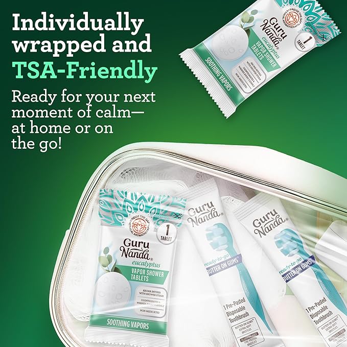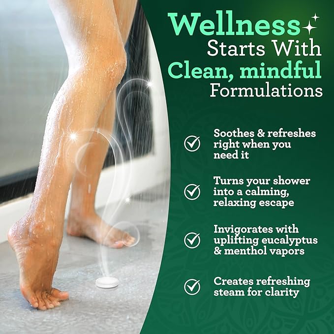 - TRANSFORM YOUR SHOWER INTO A SPA!: Revitalize with our GuruNanda shower tablets, infused with 100% natural eucalyptus & menthol. They dissolve cleanly, releasing a long-lasting, refreshing aroma that elevates your mood and melts away stress.