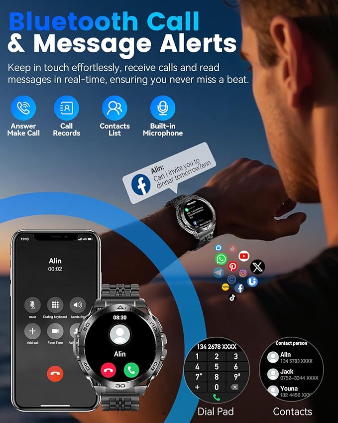 - 【Bluetooth Calling, Notifications & Voice Assistant】 Stay connected anytime with Bluetooth 5.3. Answer, reject, or make calls directly from your wrist using the built-in speaker and noise-canceling microphone—perfect for work, workouts, or hands-free driving. Receive real-time notifications from SMS, Facebook, WhatsApp, Gmail, and more. The voice assistant allows hands-free control of music, weather updates, calls, and alarms.