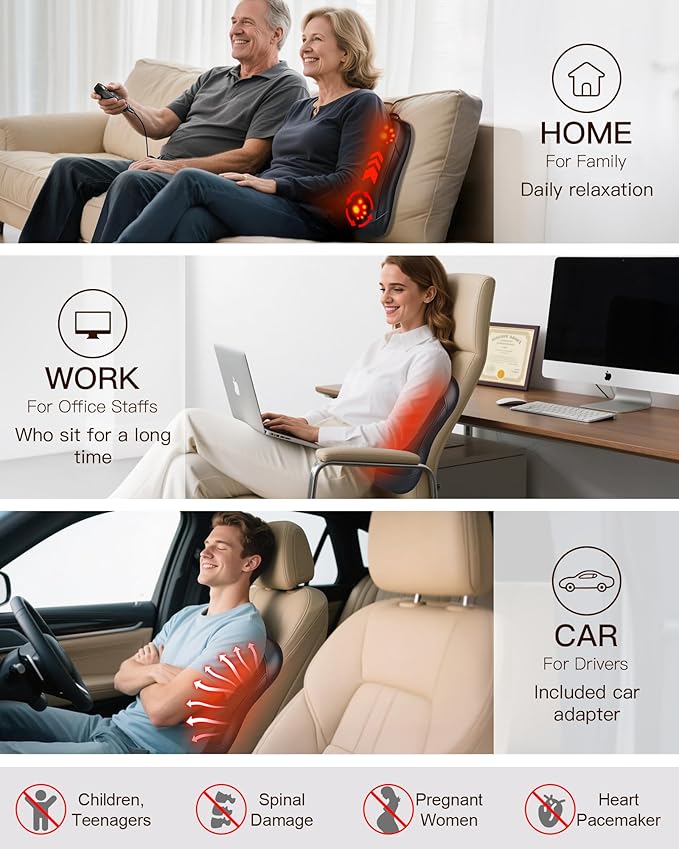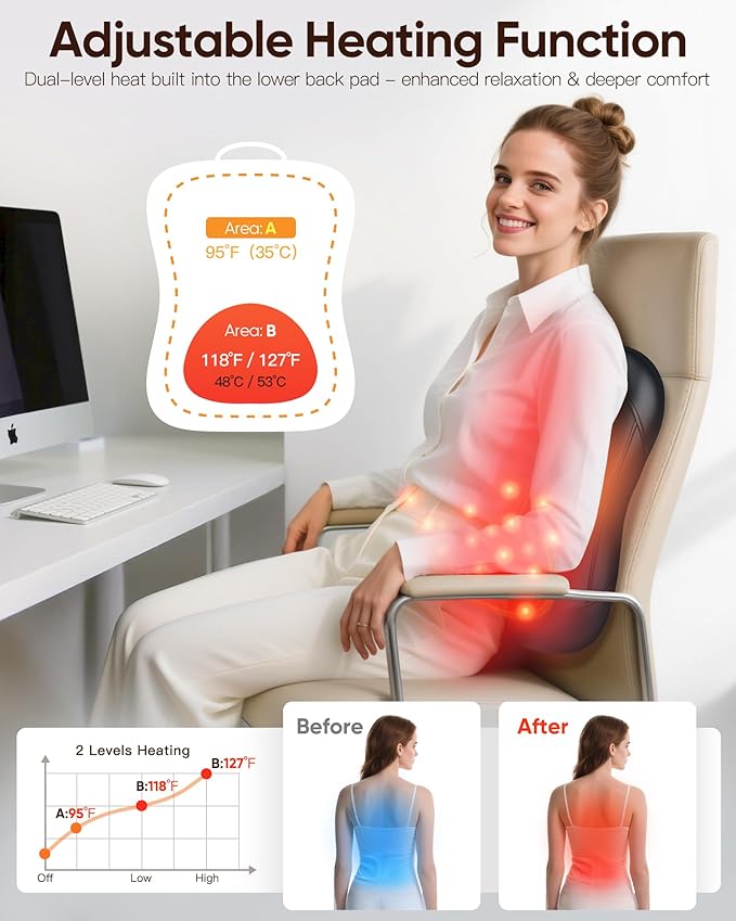 - 【Safer Use Notes】15-minute auto shut-off with heat control for everyday use . Start on Low and increase only if comfortable . Use while seated and avoid placing full body weight directly on the nodes . Try to use it for less than 15 minutes each time .