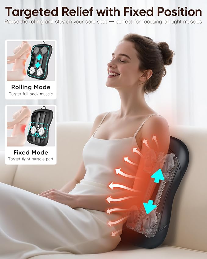 - 【Rolling Shiatsu Along Your Back】Up and down shiatsu for your back : two massage balls with four nodes each glide along a vertical track to cover upper , mid , and lower back . Use the remote to choose Full / Upper / Lower , or Spot for focused kneading . Note : this massager is not for neck or shoulder use