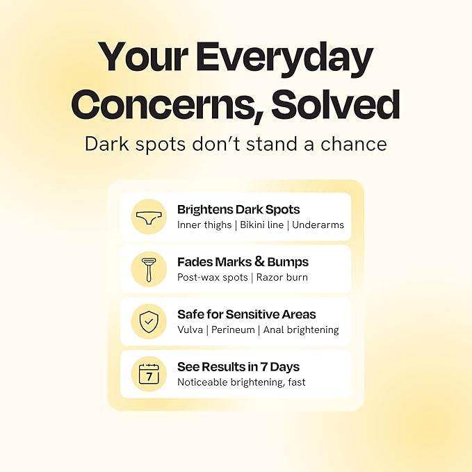 - From Hiding to Glowing: From Hiding to Glowing: Remarkable and noticeable remedy for dark spots, hyperpigmentation, and skin discoloration where you need it most - safe for all intimate areas, inner thighs and armpits. Feel confident in lingerie, swimsuits, and intimate moments.