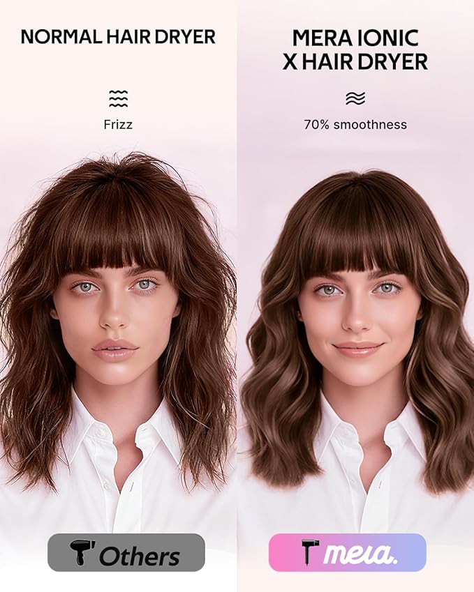 - ANTI-FRIZZ BI-IONIC HAIR DRYER FOR WOMEN: Mera ionic hair dryer combines negative and positive ions to remove static effectively, ensuring hair is free of frizz, achieving 80% smoother hair and 70% more shine, while keeping hair free from heat damage.