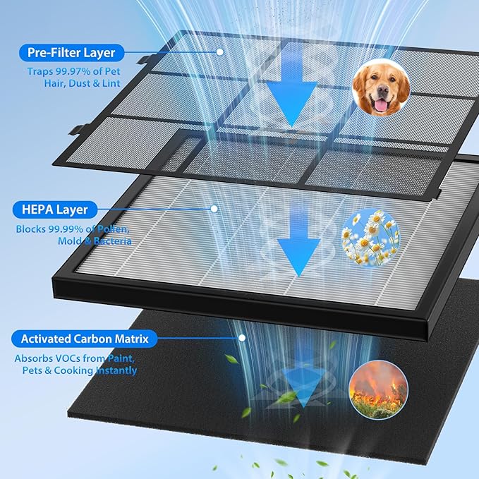 - [Washable Pre-Filter & Main Filter Replacement Reminder]: The air purifier includes washable pre-filter captures dust, hair, and pet dander, helping extend the life of the main filter. A built-in indicator clearly notifies you when it’s time to replace the main filter, ensuring continuous, effective air purification.