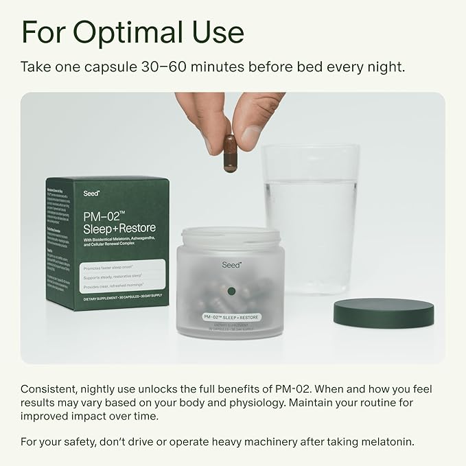Seed PM-02 Sleep + Restore - Sleep Aid for Women & Men - Non-Habit Forming Bioidentical Melatonin & Ashwagandha - Vegan & Shelf-Stable - 30 Capsules (30-Day Supply)