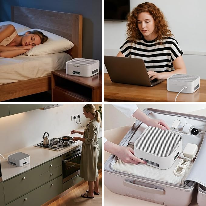 - Neat Portable Design but Powerful Usage: Enjoy sturdy material and square design, this small air purifier looks neat and beautiful. 8.4 x 8.4 x 5 inches can be placed on a nightstand, desk, car, and bag. You can use it in your living room, bedroom, office, kitchen, car, RV, hotel, camping, and travel. Take nature with you anytime and anywhere