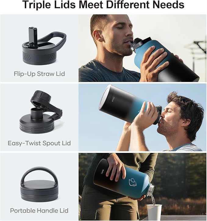- 3 Caps Pack: BUZIO stainless steel water bottle comes with 3 lids-portable handle lid, easy-twist spout lid, and flip-up straw lid to meet sports. Each lid has a thickened 360°seal for 100% leak-proof. With a wide 2.2-inch mouth, cleaning and adding ice is a breeze