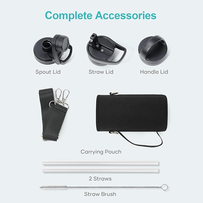 - What You Get: The pack includes 1 x 128 oz insulated water bottle, 1 x carrying pouch, 3 x lids, 2 x straws, and 1 x straw brush