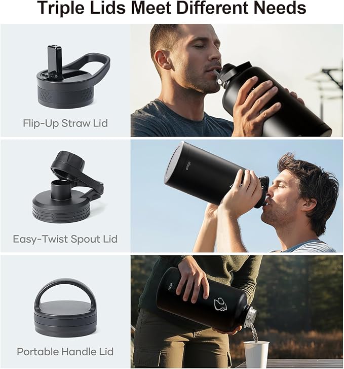 - 3 Caps Pack: BUZIO stainless steel water bottle comes with 3 lids-portable handle lid, easy-twist spout lid, and flip-up straw lid to meet sports. Each lid has a thickened 360°seal for 100% leak-proof. With a wide 2.2-inch mouth, cleaning and adding ice is a breeze