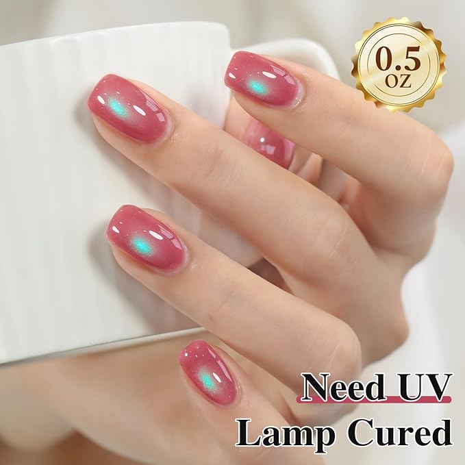 Double Rhythm Jelly Glass Cat Eye Gel Polish with Magnet 15ML Holographic Glitter Shimmer Translucent Sheer Color Magnetic Nail Polish Salon DIY at Home (Pink Teal-MC1267)