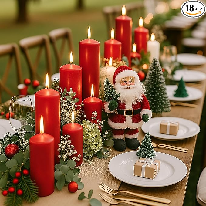 18 Pcs Red Pillar Candles Bulk Set,Hurricane Candles,3 Different Lengths (6 Each),Dripless Unscented Smokeless,Gives You a Better Atmosphere When Organizing Wedding or Event Party.