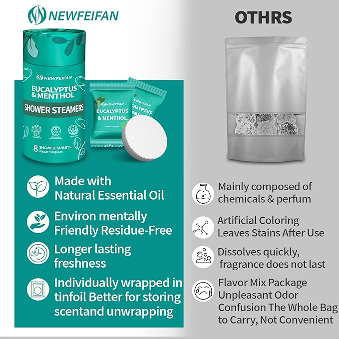 - Indulge in Spa-Like Relaxation: Experience the soothing effects of our shower steamers, infused with organic eucalyptus and mint essential oils. Transform your ordinary shower into a luxurious spa experience.