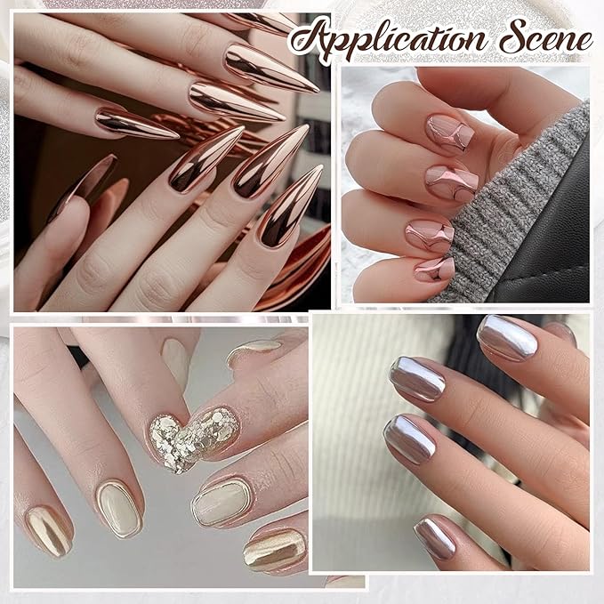 - Unleash Creative Manicures - The 4 Colors Chrome Nail Powder Set transforms your nails into a vibrant canvas. With 6 vivid colors, this metallic mirror effect nail powder allows you to create diverse nail art designs like the mirror, bubble, wave, shell pattern, French manicure, gradient effect and 3D effects. Perfect for those who love to experiment with different looks.