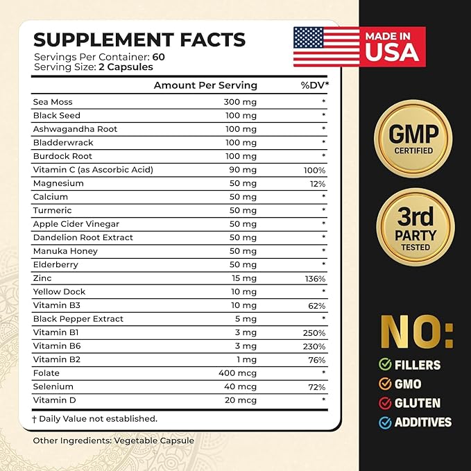 - All in one capsules made with organic Sea Moss, Black Seed, Ashwagandha Root, Bladderwrack, Burdock Root, Vitamin C, Turmeric, Apple Cider Vinegar, Dandelion Root Extract, Manuka Honey, Elderberry & Yellow Dock. Our clean, non-GMO men's multivitamin formula is packed with nature's finest to support your daily health routine without compromise.