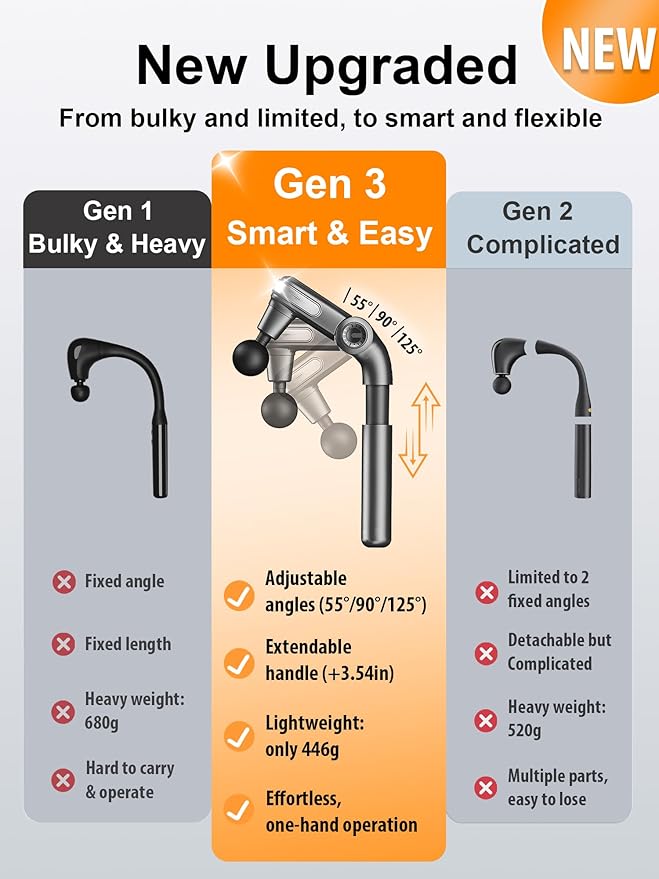 - Adjustable Arm & Extendable Handle – Reach Every Sore Spot with Ease:Designed for full-body self-massage, this back massage gun features a 3-angle adjustable arm and a retractable metal handle that extends from 8.6 to 15.7 inches. Easily target hard-to-reach areas like your lower back or shoulders without assistance—perfect for solo recovery sessions.