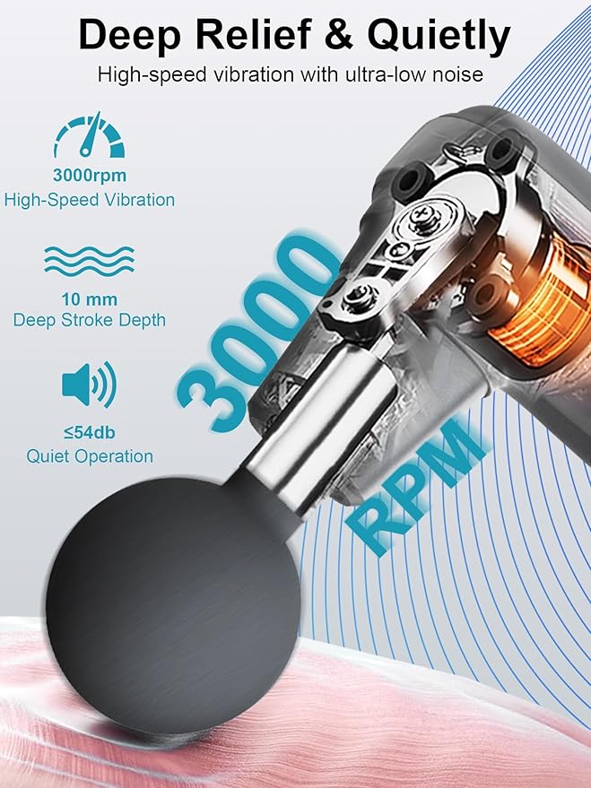 - Powerful & Ultra-Quiet Deep Tissue Massage – 5-Speed Muscle Relief Gun:Equipped with a high-torque motor delivering up to 3,000 RPM and 10mm deep tissue penetration, this massage gun provides effective relief for muscle soreness and stiffness. Operating at under 40dB, it ensures a quiet and relaxing experience. With 5 adjustable speed levels and smart pressure feedback, it adapts to your needs—from gentle relaxation to deep tissue recovery—offering a fully customized massage anytime, anywhere.