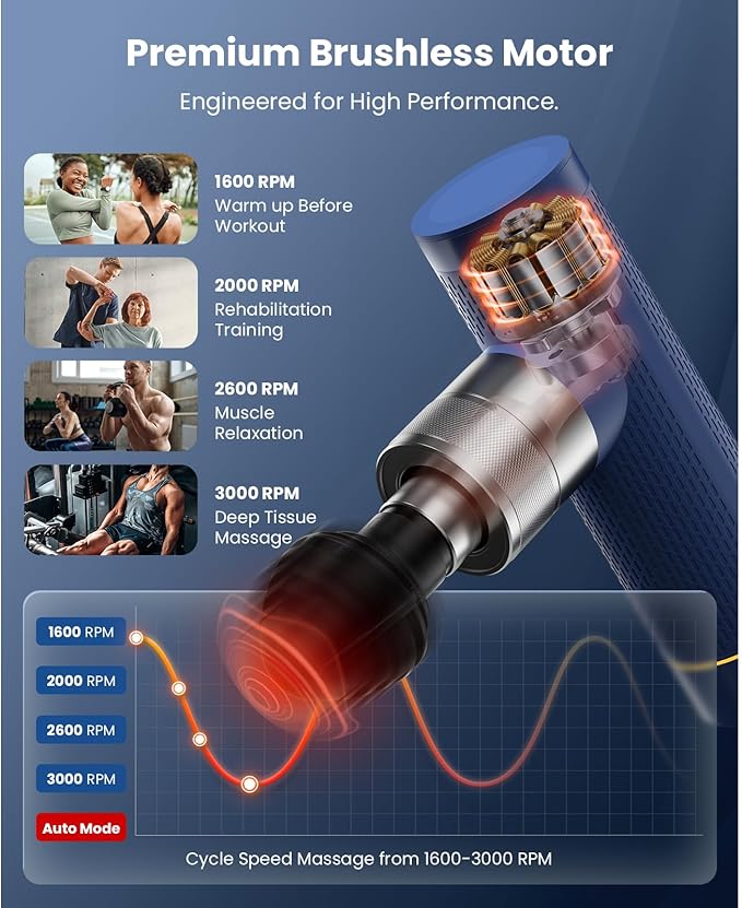 - Illuminate Your Recovery with Style: Featuring a captivating LED light system, the muscle gun gives you complete control over your recovery routine by displaying precise pressure feedback. It offers 5 adjustable speeds ranging from 1600 to 3000 RPM, enabling you to fully experience the advantages of massage therapy for muscle recovery, improved performance, stress relief, restful sleep, and more. It also features an auto speed that cycles from 1600-3000 RPM