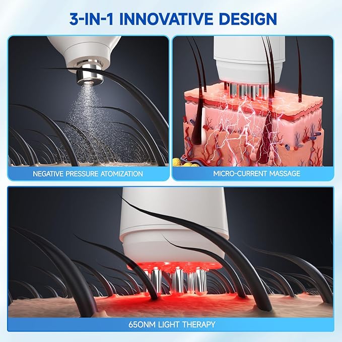 - 3-in-1 Scalp Massager & Hair Oil Applicator:It combines Spray Technology,vibration, a built-in oil container.Spray Technology + Red Light Therapy dual-mode superposition operation,Unlock Breakthrough Microcirculation Activation for Your Scalp.The nano - level atomization precise coverage of the hair root is not sticky.Ideal for maintaining scalp health.