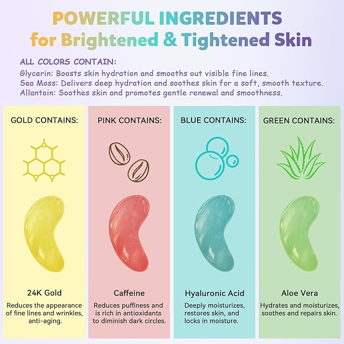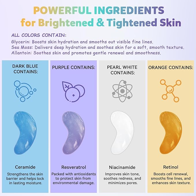 - The Ultimate 8-Color Eye Mask Experience: Why settle for one when you can try them all? The MASKISS 8-pack eye mask set features eight vibrant colors, each powered by a unique active ingredient—from caffeine and retinol to hyaluronic acid, niacinamide, ceramides, and more. Perfect for discovering what your skin loves most.