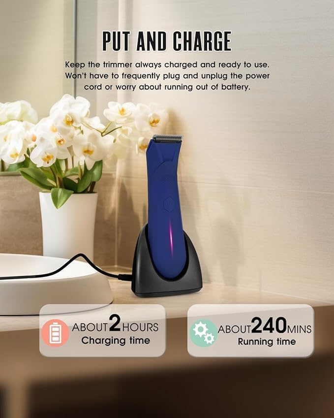 - ⚡Dead Trimmer Mid-shave? ⚡ Game over. The included charging dock auto-charges the groin trimmer for men 24/7—slap it on, forget it. A full charge lasts as long as 240 minutes. Chest at 7 AM? Balls at midnight? The ball trimmer's always juiced. No excuses