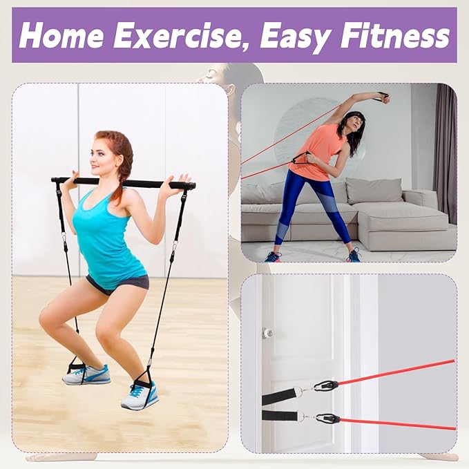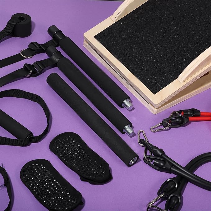 - Complete Pilates Kit with Added Accessories: Includes 1 Pilates board, 1 bar, 2 sets of resistance bands (20-40 lbs), non-slip silicone socks, 1 training mat, a resistance band door anchor, a barbell, and a convenient storage bag for easy carrying.