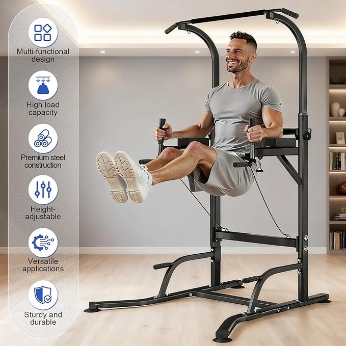 - Multi-Function Dip Station for Home Gym Use: Supports a wide range of upper body workouts including pull-ups, dips, push-ups, leg raises, and inverted rows. Ideal for users building a complete home gym setup