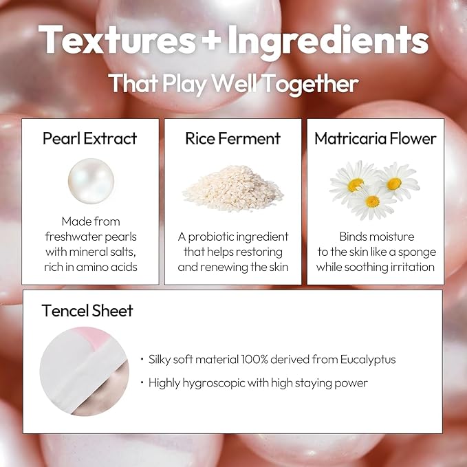 - CLEAR SKIN - Our Pearl mask, a tencel sheet mask with Pearl extract, contains anti-aging benefits to promote rejuvenation and help your skin emulate the soft, classic beauty of the gemstone.