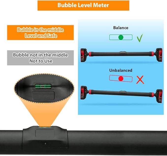 - BUBBLE LEVEL METER: Equipped with level meter, through the middle position of the bubble to judge that the pull up bar is in a level state or not. (Note: The correct installation method is that the arrow of the lever points upwards and the horizontal liquid bubble is balanced).