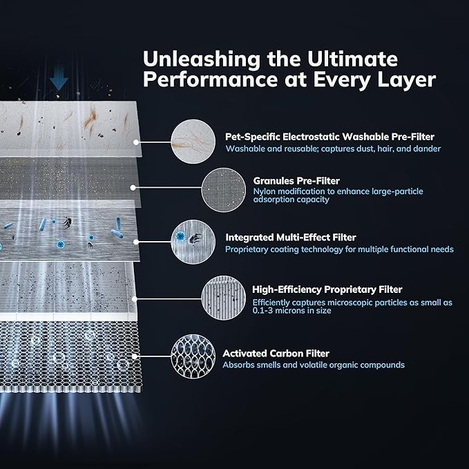 - 【Game-Changing All-in-One Multi-Effect Filter】Breaking the limits of single-function filters with a 5-layer (others only 2–3 layers) and extensive material testing. By integrating multi-effect materials, one filter delivers powerful performance—effectively removing dust, dander, pollen, wildfire smoke, VOCs, odors, and fine particles (independent lab tests on ISO 17025 standards),however, others only have a singular function and cannot handle diverse needs, utimately imposing additional burden