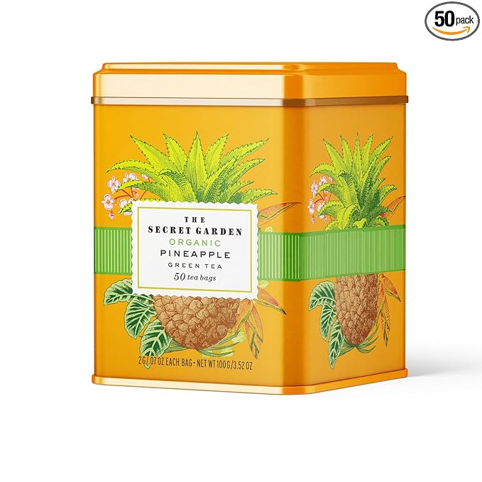 Life Plus Style Gourmet The Secret Garden Organic Pineapple Green Tea Premium Naturally Caffeinated Tropical Fruit Daily USDA Certified Green Tea Non GMO Herbal 50 Tea Bags Gift Tin Enjoy Hot or Iced
