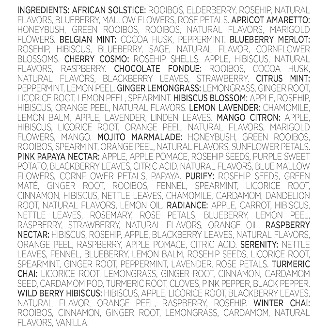 - TEA BLENDS - 40 pyramid infusers with 2 of each herbal tea blend: African Solstice, Apricot Amaretoo, Belgian Mint, Blueberry Merlot, Cherry Cosmo, Chocolate Fonude, Citrus Mint, Ginger Lemongrass, Hibiscus Blossom, Lemon Lavendar, Mango Citron, Mojito Marmalade, Pink Papaya Nectar, Purify, Radiance, Raspberry Nectar, Serenity, Strawberry Apple, Wild Berry Hibiscus, and Winter Chai.