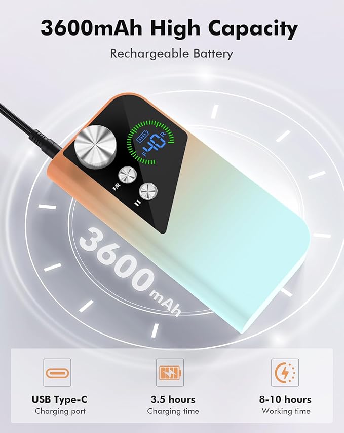 - Long-lasting Performance: Equipped with a 3600mAh rechargeable battery, this nail drill professional provides 8-10 hours of continuous use, perfect for home use or professional nail technicians on the go. The low noise and low vibration design ensure a comfortable user experience