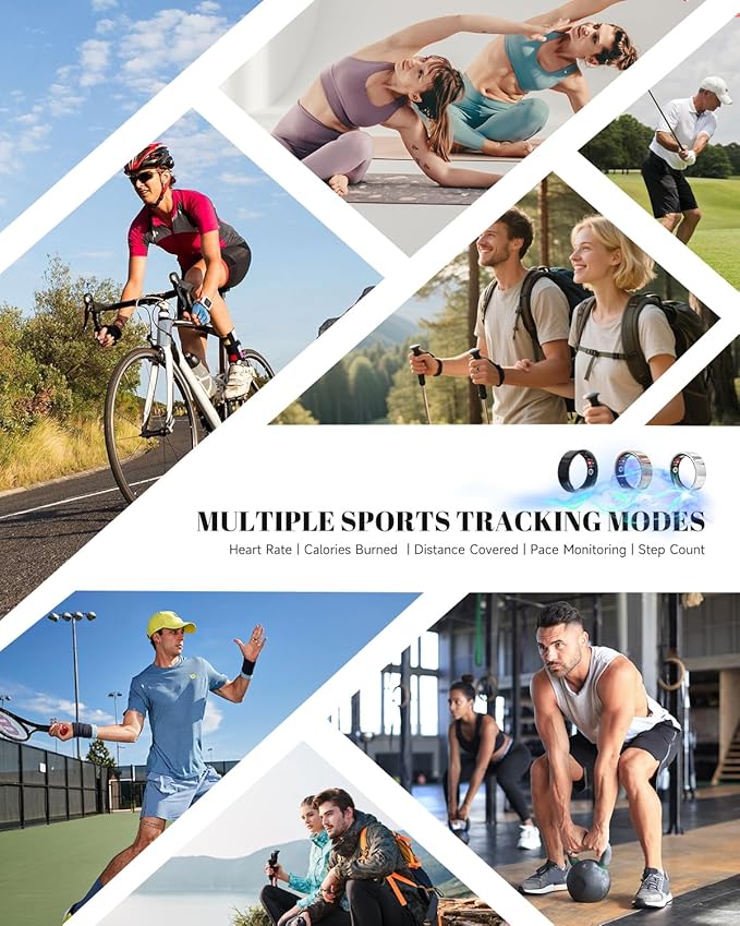 - Supports 128 Sports Modes with Real-Time Tracking - Whether you're walking, running, cycling, dancing, doing yoga, or more, this ring supports 128 exercise modes, providing detailed records of calories burned, distance, steps, and duration. It encourages an active lifestyle with goal-driven data, helping you maintain consistency, boost performance, and track fitness progress over time.