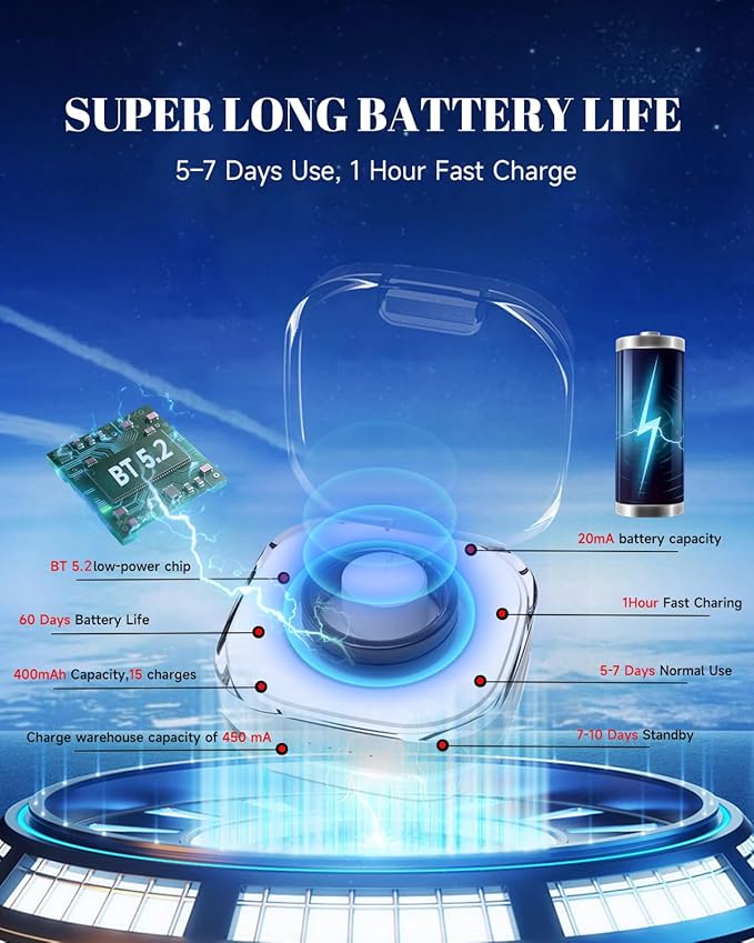 - Long Battery Life with Fast Magnetic Charging - The built-in 20mA battery ensures 5–7 days of continuous use on a single charge and up to 10 days of standby time. The magnetic charging case allows quick and secure recharging, ideal for travel or daily use. No bulky chargers needed—just snap it in and recharge within 1 hour. Enjoy long-lasting performance without frequent charging.