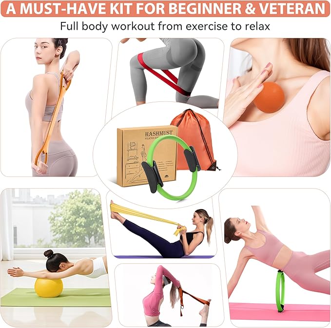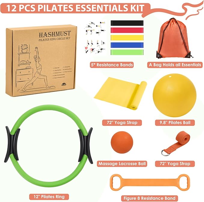 HASHMUST Pilates Ring Kit 12 PCS for Women, Home Workout Equipment with Magic Circle, Mini Exercise Ball, Resistance Bands, Massage Lacrosse, Yoga Strap, Full-Body Fitness Set for Toning & Gift