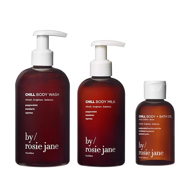 By Rosie Jane Chill Body Care Bundle – Chill Bath & Body Oil (125ml), Body Milk with AHA & Peppermint (250ml), Hydrating Body Wash with Mandarin & Cypress (350ml), Relaxing Aromatherapy Trio
