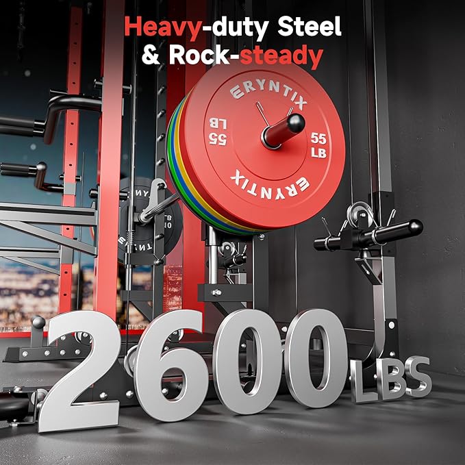 - ๐ป2600LBS Heavy-Duty Capacity---Constructed with reinforced Q235 steel, this rack supports up to 2600 lbs, ensuring stability and safety during heavy lifts. Linear bearings provide smooth barbell motion for a wide range of users.
