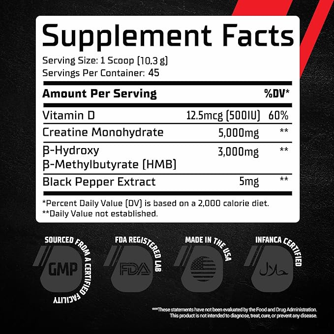 - BUILD LEAN MUSCLE AND STRENGTH – Maximize your gains with creatine monohydrate powder combined with 3g of HMB. This powerful HMB creatine powder helps prevent muscle breakdown during, making it a great for muscle growth. Get more out of every workout with this creatine and HMB supplement designed for serious athletes looking to build strength and lean muscle.