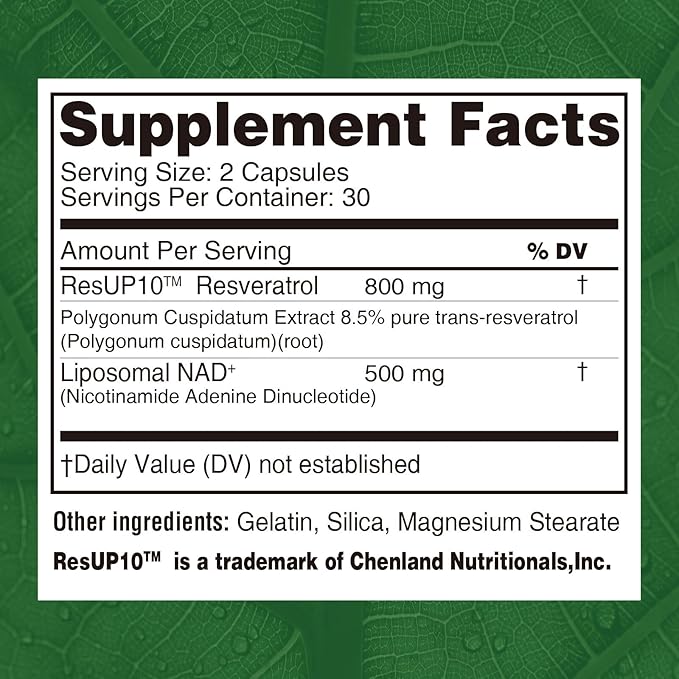 - Patented ResUP10 Resveratrol Complex: 800mg of clinically inspired Resveratrol extracted from Polygonum Cuspidatum root (8.5% pure trans-resveratrol), delivering 108mg potency per 60mg dose