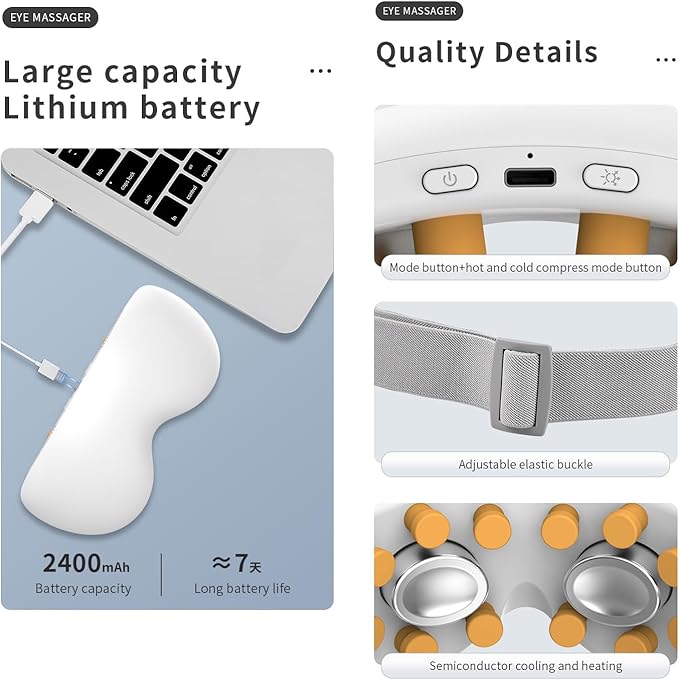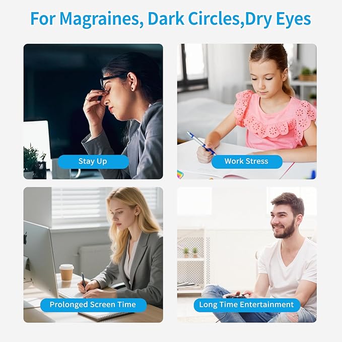 - Eye Mask Massager, Adjustable and Ergonomic Eye Mask Design – Soft, breathable massage eye mask that comfortably fits all face shapes. Choose from multiple heat/cooling settings and intensity levels, perfect for work breaks or bedtime.