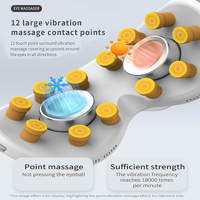 - Eye massager, vibration and air pressure massage technology – with vibration mode and air compression, kneads acupuncture points and promotes deep relaxation. Heated eye massagers with vibration and cooling options ensure a spa-like experience at home.