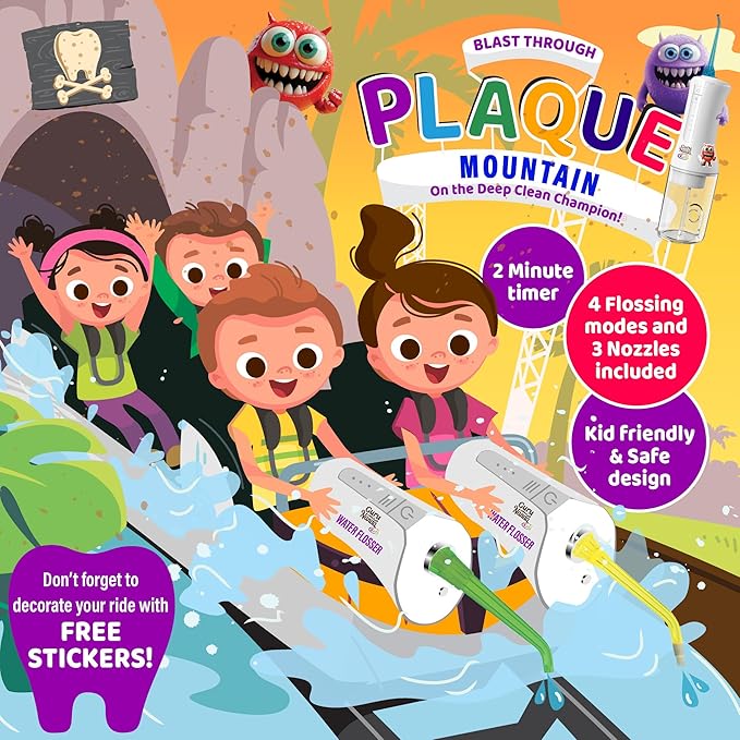 - DISCOVER A BETTER WAY TO FLOSS!: Keep flossing quick and mess-free with our fluoride-free Giraffe Floss Picks, a value pack of 90 picks designed for tiny teeth! Then, take it a step further with our kid-friendly water flosser, featuring 4 gentle pressure settings and a two-minute timer. It’s perfect for removing plaque and food particles, giving your kids a fun and effective flossing experience every time!
