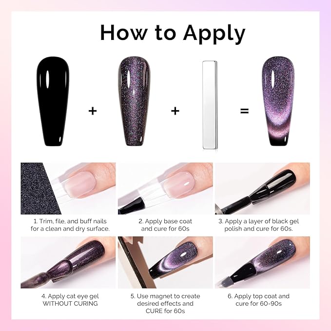 - CREATIVE & FASHIONABLE MANICURE: Whether you're a beginner or a professional, you can unleash your creativity to make the nail art you want with cat eye gel of different textures and colors. Formulated with healthy ingredients, our gel nail polish minimizes nail damage and keeps unpleasant odors at bay. Revel in vibrant, long-lasting results while prioritizing your nail health and application experience.