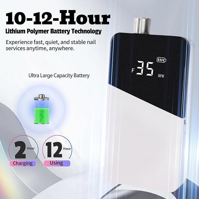 - 【Large capacity battery】Rechargeable and Cordless: This rechargeable nail drill is equipped with a 2500mAh large-capacity battery, which can be fully charged in just 2 hours and can be used continuously for 8-10 hours. The smart LCD display allows you to know the speed and power level at any time. The rechargeable nail drill is compact and can be put in a travel bag or suitcase. You can use this rechargeable nail drill anytime, anywhere.