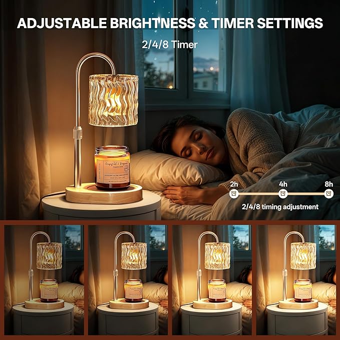 - DIMMABLE BRIGHTNESS & AUTO SHUT-OFF TIMER: Effortlessly tailor your space with adjustable settings for mood lighting or fragrance intensity. The candle lamp built-in timer (2H/4H/8H) automatically switches off the warmer, eliminating fire risks if you fall asleep, leave home, or want controlled scent sessions. No more forgotten candles